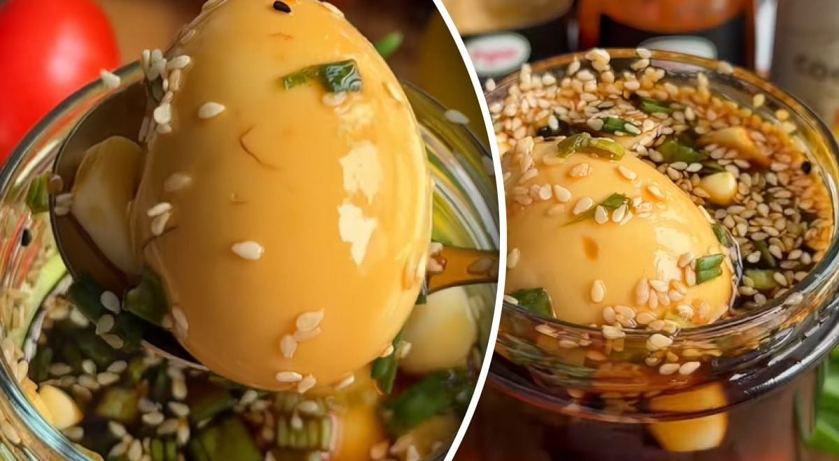 Mescolare in un barattolo cipolle verdi tritate finemente, salsa di soia, acq aglio, sesamo e salsa piccante. Mettete quindi le uova nella marinata, chiudete il barattolo e mettetelo in frigorifero per 6 ore.